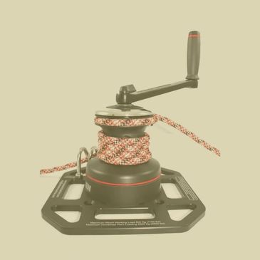 The harken 40.2 sta winch is a two speed winch with a self tailing or lokhead top so the rope does not have to be managed. It is mounted to a versatile rigging plate that can be hard or soft mounted to appropriate ballast. A 36V makita or corded milwaukee right angle drill can pull up to 1000#. It all fits in a pelican air 1595 to be shipped to your destination. Contact us for more details.